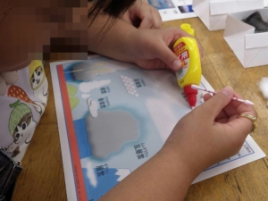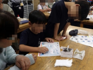 雲のなまえや雲のできかたを学んだあと、ペットボトルの中に雲を作る実験をしました。わたをつかって10種類の雲のパネルをつくり、それを外に持っていって、雲を観察しました。この日は、よく晴れていたので入道雲や筋雲がみることができました。
