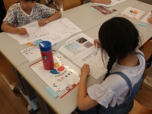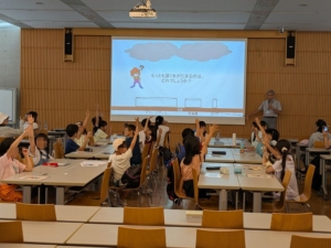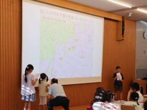 テレビなどで放映される天気予報がどのようにして作られているのかを、気象観測の方法、高気圧・低気圧・前線などのしくみを学び、当日(7/21)の天気図・雲や雨の状況から翌日(7/22)の天気図を使って翌日の天気を予想し、最後に各自が自分の担当地域の天気予報を発表しました。恥ずかしがる子もいましたが楽しんで発表する子も多かったです。最後に気象庁の「急な大雨・雷・竜巻から身を守ろう!」ビデオで雷雲防災の啓発をしました。