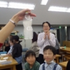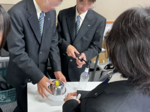 京都府立南陽中高等学校は、京都府木津川市に立地しています。同地では、1953年8月14日〜15日の豪雨で、土石流や川の氾濫で死者290人にも及んだ大災害「南山城水害」が発生しており、地元の風水害の危険性と防災気象情報の活用について学ぶ、特別授業を実施しました。中学1年生39名と、同校教諭5名が参加し、実験を交えながら気象の仕組み、気象災害、防災気象情報について学びました。実験は大好評で、休憩時間にも雲作りやマグブルクの半球実験を、楽しそうに体験していました。気象予報士会員でもある同校の阪本和則教諭による、同校の生徒ともに「南山城水害」被災地のフィールドワークの実施、被災経験者のヒアリング、3次元プリンターで地形モデルを作成し水を流しての洪水の再現結果等の講義に、生徒達は熱心に聞き入っていました。大雨による災害から身を守るために、防災気象情報やハザードマップ、避難のタイミングなども学んでいただき、楽しみながら防災を学ぶ機会となりました。