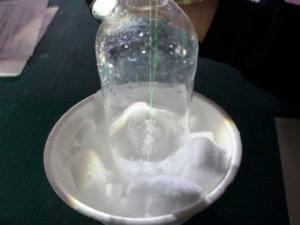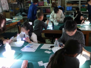 本格的な冬が近づく中、「雪の結晶作りと冬の天気」の教室を開催しました。23人のこどもと保護者の皆さま8人が参加して楽しく学びました。重りを付けたテグスをペットボトルに吊り下げて固定する作業はみなさん苦労していましたが、全員がとてもきれいな結晶を成長させることが出来ました。雪はどのようにして降るのか、なぜ日本海側に大雪が降るのかなど、物語風のパワーポイントで楽しく学習しました。